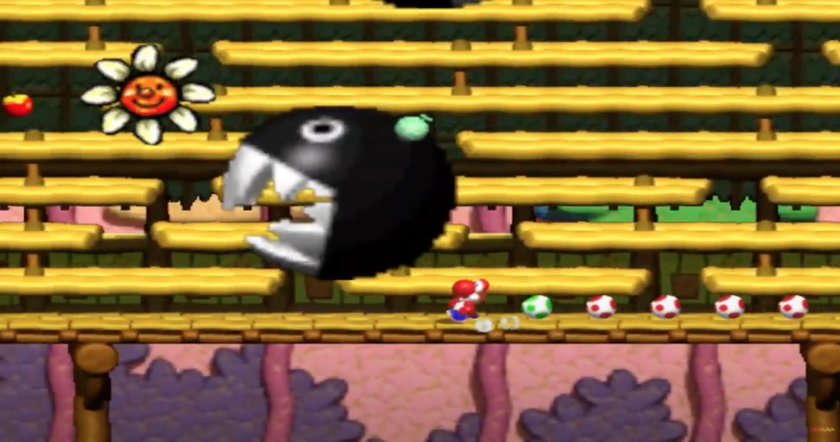 Two varieties of Chomps are encountered as enemies, Chomp Sharks and Flaming Chomps, the latter of which replaces Incoming Chomps and makes their first appearance. A single Chain Chomp also appears in the game, but like the previous two Yoshi's Island games, Chomps do not appear themselves.
