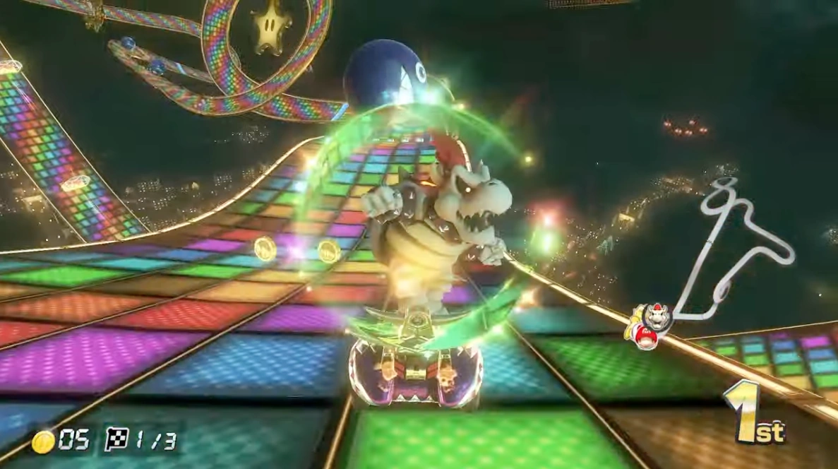 Several Chomps are also seen in Mario Kart 8 and Mario Kart 8 Deluxe. In this game, they can be found in several courses with the most notable being the returning N64 Rainbow Road from Mario Kart 64, here, they can be seen bouncing on the wavy parts of the track knocking over any racers that collide (unless they're under the effects of a Bullet Bill, Starman, or Boo). Chomps can also be seen in several DLC courses such as the returning 3DS Rainbow Road from Mario Kart 7 as well retaining their behavior from the respective games.