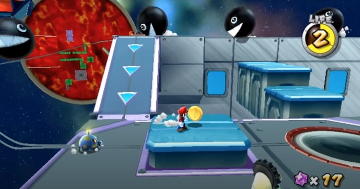 Chomps make a reappearance, this time being slightly more common than in Super Mario Galaxy. Chomps are either seen rolling around the planet on their own or are spawned from holes and portals. The Chomps also tend to follow a set path as well as seen in Galaxies such as the Flip-Swap Galaxy and can also be moved along tracks as well. A Chomp can only be beaten with a Rainbow Star. Chomps can be especially annoying on skinny platforms because if they hit you, you will end up flying into space. Even if they do not send you flying into space, they will push you off the edge to your doom. Chomps can also be lead into large glassy holes in the ground to reveal a Launch Star. The Chompworks Galaxy is a large factory that makes Chomps. The game includes several varieties of Chomps as well such as Chomp Pups, Golden Chomps, and even the new Silver Chomp (which homes in on Mario/Luigi). Unlike the Boulders, Chomps are immune to the effects of the Rock Mushroom. Chomps can either be beaten with the effects of a Rainbow Star or having them collide with a wall or another Chomp, they can also be frozen in place by the Co-Star Luma (this tactic can be used in several situations such as in the Chompworks Galaxy to obtain the Comet Medal easier or during the C'mere, Goomba in the Boulder Bowl Galaxy to lure the Goomba to the Gold Gearmo without it being flattened. Chomps can be found in the Flip-Swap Galaxy, Boulder Bowl Galaxy, the Flipsville Galaxy, and the Chompworks Galaxy. In one part of the Flipsville Galaxy, two paths of Chomps intersect so they automatically collide, resulting in several Star Bits being released.