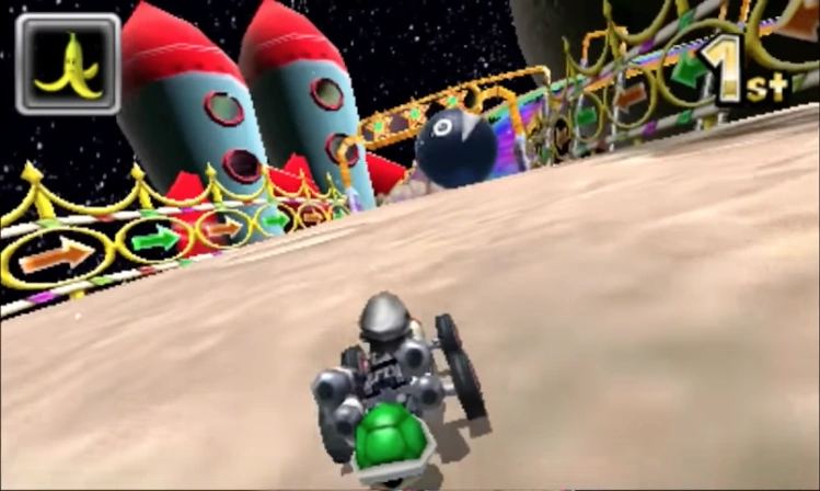 Several Chomps can be seen in Mario Kart 7 appearing on the moon section of Rainbow Road. They are seen rolling around on the Moon and bouncing off the craters and will knock over any racers that run into them unless they're under the effects of a Bullet Bill or Starman.