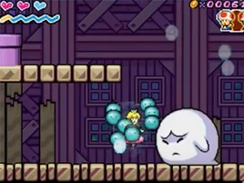 Circular Clouds are harmless enemies that appear in Super Princess Peach. They appear in certain areas where certain platforms or gimmicks are required to advance forward. During that time, they appear in a spirit-like form if you try using the Joy vibe and get close to them (as they're normally near the desired destination) they will cling on to Peach, turn blue and weigh her down and then switch off her Joy Vibe so this is where you have to find a different alternative.