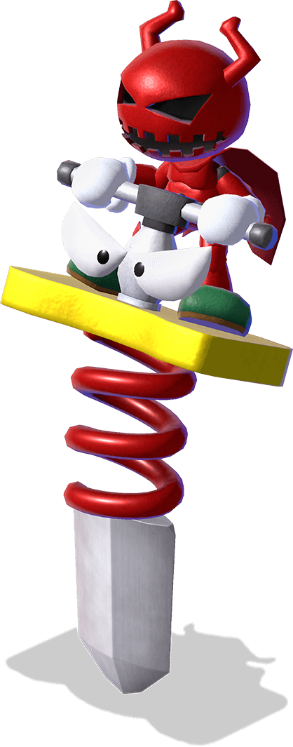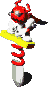 Claymorton is a small, red, devil-like character who rides around on a sword with a pair of eyes in the manner of a pogo stick.