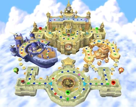 There are four areas that make up the board: the courtyard, Brighton's Temple, Twila's Airship, and the castle itself. Warp Pipes are located on the top and bottom parts of the board (three on each side) that warp players from one side to the same colored pipe on the other side.