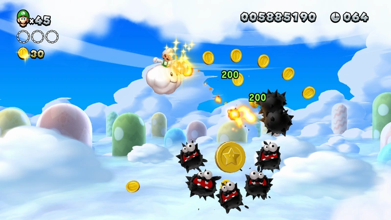 - Star Coin 3: After the third Lakitu, the player needs to use its cloud to get the Star Coin which is encircled by two Fuzzies.