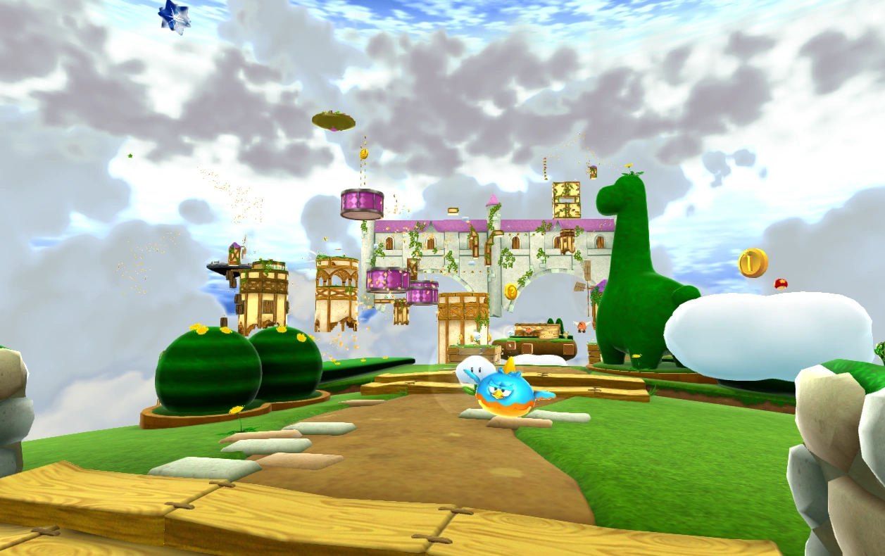 This is the only main mission in the galaxy. Mario starts out with a Cloud Flower in front of him, and some small platforms and clouds interspersed across a long distance. Mario can use the power-up to go across this, and then find a planet with a windmill. This windmill makes a current of wind, so that the clouds Mario creates follow a trail. This wind leads him to the Percussion Area, where Mario can bounce all the way to a Launch Star. After following some more wind currents to bypass some large gaps, Mario can take another Launch Star to a 2D section that looks like a castle. Following some more wind currents with the 2D restriction, and dodging a moving wall, Mario can climb all the way to a Power Star.