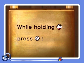 The player must input a sequence of buttons indicated onscreen, varying between any of the D-Pad button or the A button, which themselves vary between each difficulty level. If the player presses the wrong button or holds the button in wrong order, they lose at the microgame.
