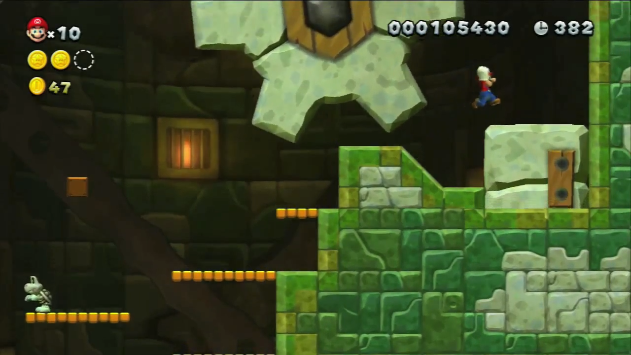. Here, Mario or other playable characters are required to travel across them in order to progress. If a character is crushed by a Cog, they instantly lose a life.