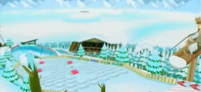 The course's start line leads to a right turn of the course. Ahead, the racers encounter a cannon that blasts the player to the top of the mountain. Landing on the top of the mountain, there are half-pipe ramps. Making a left turn, there are bumpy ramps and a boost ramp. Two piles of snow can slow down the racer. The racers will approach small bumpy hills and the boost ramps. The player will make the first right U-turn that has a half-pipe ramp and a left U-turn where the player will encounter a half-pipe ramp. The racers will race on a straight track with a boost ramp, half-pipe ramps and off-road snow. The snowboarding Shy Guys can disrupt the driver if the driver hits them. The racers make their right turn to return to the start.