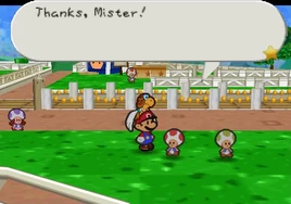 Dane T. is a young Toad that resides in the southern section of Toad Town , which is near the train station. He is always seen with his best friend, who is a young green Toad. It is known that he and the Red Yoshi from Lavalava Island are pen pals. Parakarry delivers mail between them. Dane T.'s letter is found in Dry Dry Desert .
