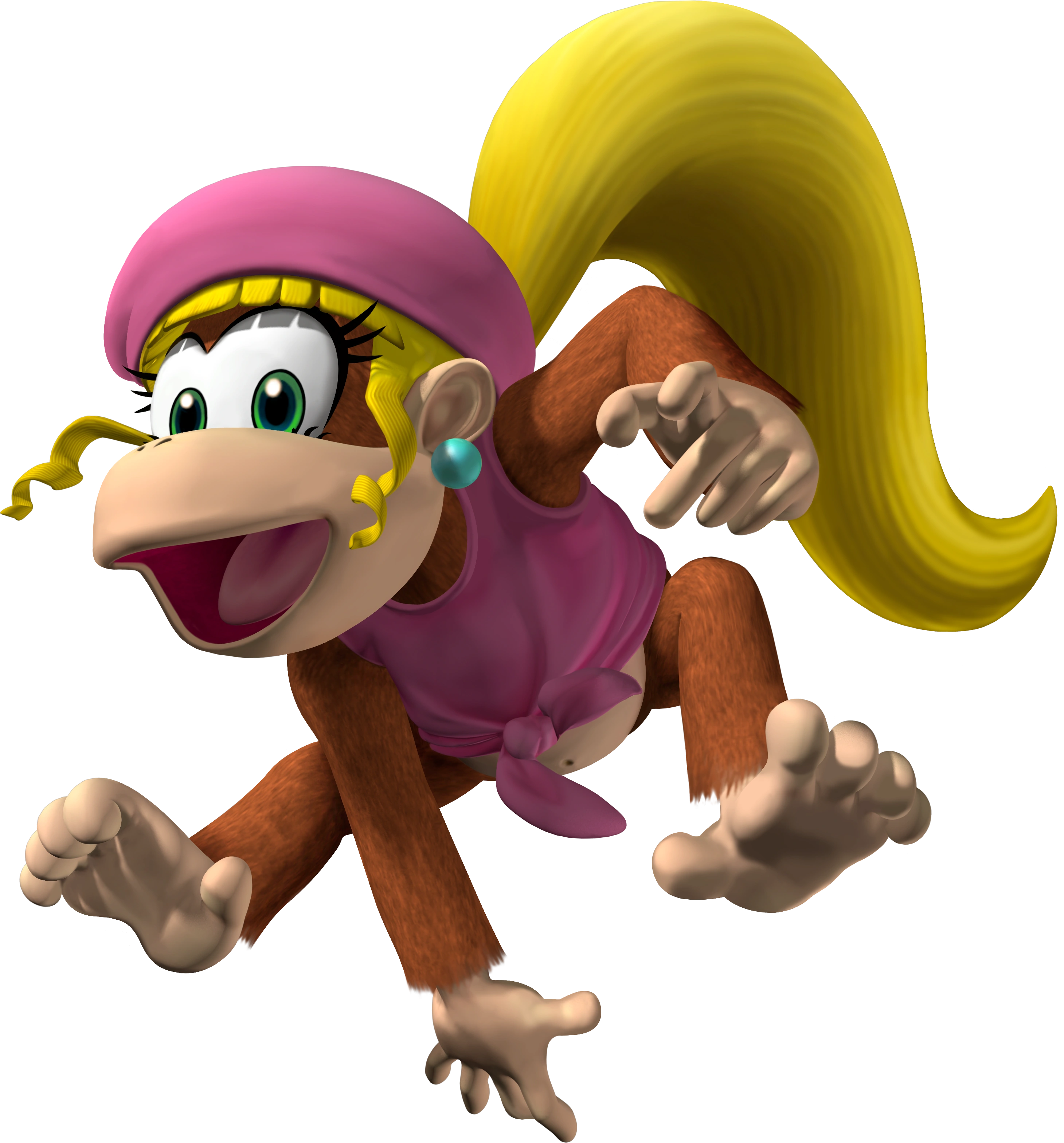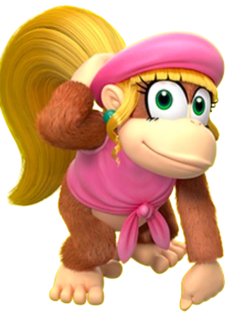 Dixie Kong is Diddy's girlfriend and one of the more recurring Kongs, both within the Donkey Kong games and the Mario games. Dixie made her first appearance in Donkey Kong Country 2: Diddy's Kong Quest. Dixie has a little sister named Tiny Kong, who filled in as her replacement in Donkey Kong 64. Dixie has a signature ability of twirling her hair to float downwards.