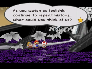 Doe T. is a male Toad that can only be found in Boggly Woods during his trouble after it has been accepted. Doe T. wanted help getting to The Great Tree but enemies were blocking the way. Mario must defeat all enemies in the area while escorting Doe T. to The Great Tree. After doing so, Doe T. rewards Mario with 20 coins. Doe T. remains outside of The Great Tree for the remainder of the game.
