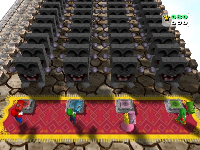 The goal is to set up the most Whomps, which act as dominoes. Each character wields a mallet and a switch. The players have 10 seconds to hit the switches as many times as possible. Each time a switch is hit, a Whomp is set up. When the time is up, the characters punch the Whomps (in Mario Party 4) or push them (in Super Mario Party Jamboree), knocking them over. The character(s) with the most Whomps knocked over win(s).