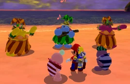 The Doot-Doot Sisters are a group of two female Piantas who have made a few appearances within Super Mario Sunshine. They are street performers who are often accompanied by a blue male Pianta who plays the ukelele. The Doot-Doot Sisters are colored yellow and pink respectively, and often end their sentence with "doot." The Doot-Doot Sisters appear to be popular throughout Isle Delfino, although they do not like several of their fans.