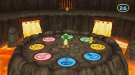 The characters have to use a Ground Pound to press switches of the same color at the same time. They have to press all four switches to win. Whenever a switch is activated, lava spouts in the background, then hardens into a metal platform, which makes Bowser Jr. look nervous. The switches will not activate if the characters strike different-colored switches, or their Ground Pounds are out of sync. If all four sets of switches are activated within 30 seconds, the players win. If the players fail at activating all the switches, Jr. is victorious.
