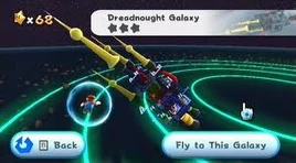 The Dreadnought Galaxy is a galaxy in Super Mario Galaxy. It is quite similar to the Battlerock Galaxy since it centers around the titular station, the Dreadnought (which is actually a battleship). This galaxy plays a remixed version of the Space Fantasy theme, with strings and brasses and less synth, another feature coming from the Battlerock Galaxy, although the original Space Fantasy returns in some areas as well. Its unlock criteria is 48 Power Stars, including the Grand Star from Bowser Jr.'s Lava Reactor.