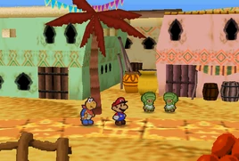 In Paper Mario: The Thousand-Year Door , Lumpy mentions a visit to Dry Dry Outpost during his quest to strike oil, which the player may give him some money to invest in this project. This visit can be divulged further by listening to "Part 3: A Helping Hand," the third tale in his adventure.
