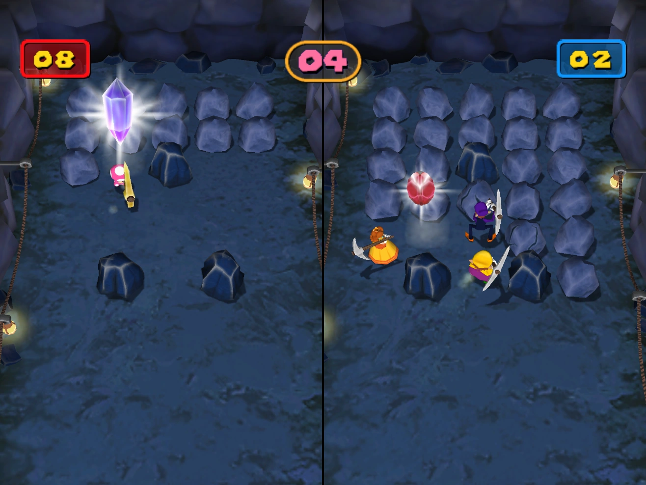 Each side has to try and discover gems by smashing rocks. Red gems are worth a point, while purple gems are worth three points. There are dark-colored rocks that cannot be broken. Just as in the intro, the solo character's golden pickaxe can break rocks with a single hit, and each team member's smaller pickaxe can break a rock by hitting it three times. Easy Pickings has a time limit of 30 seconds, after which the minigame ends, and whoever collected the most points is the winner. If both the solo character and team end with the same number of gems, the minigame ends as a draw.