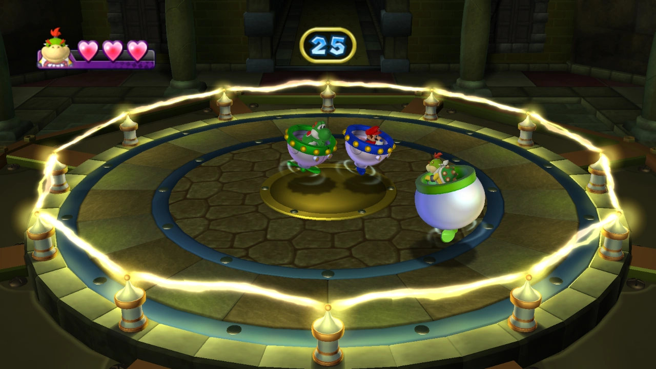 An electric rail generated through a series of pylons, having nearly an octagonal shape, surrounds the ring in the minigame Bumper Sparks, in which the object is to hit Bowser Jr. into the electric rail three times to defeat him and therefore win. The playable characters do not have a health meter, so they do not lose health from touching an electric rail, but doing it still stuns them temporarily.