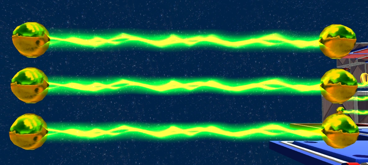 In some galaxies, an electric rail can be deactivated by either stepping on Flipswitch Panels, hitting a Spiky Topman with a spin attack into them, defeating it as well, or defeating an Undergrunt Gunner. Regardless of which direction the camera faces, the reflection shown on the spheres of an electric rail is always exactly the same.