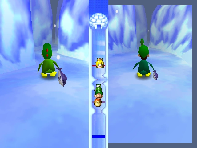 During Filet Relay, the characters will be dressed as penguins, and they must travel through a slippery path. The slippery path will be full of obstacles, winding turns, and Mr. Blizzards that toss snowballs. The course is split into three different parts. The team of three will have one character running through each section of the course, while the lone character will have to run through the whole course by themselves. The first section of the course has a giant glacier in the center of it, in which the characters must centure around. The second part of the course has a narrow opening in the cliff that forms a zigzag formation. The last part of the course consists of small hills and giant Mr. Blizzards throwing snowballs. If a character is hit by one of the snowballs, then they will be knocked down. The objective of the minigame is to venture through the icy course and get the fish to the igloo at the end of the course. The player can move his or her penguin by pressing