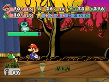 Fleeing first appears in this game. This action can be chosen from the beginning. Mario and others can flee from almost any battle except for bosses. However, Fleeing will not always work and when it doesn't, Mario and company are left wide open for enemy attacks. Mario can flee from copies.