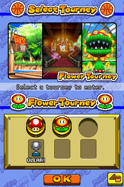 The Flower Tourney is the second tournament in Mario Hoops 3-on-3. It is unlocked by completing Mushroom Tourney. It consists of four courts: DK Cruiser, Luigi Mansion, Daisy Garden, and the unlockable Malboro Garden. Completing the Flower Tourney unlocks the Star Tourney.