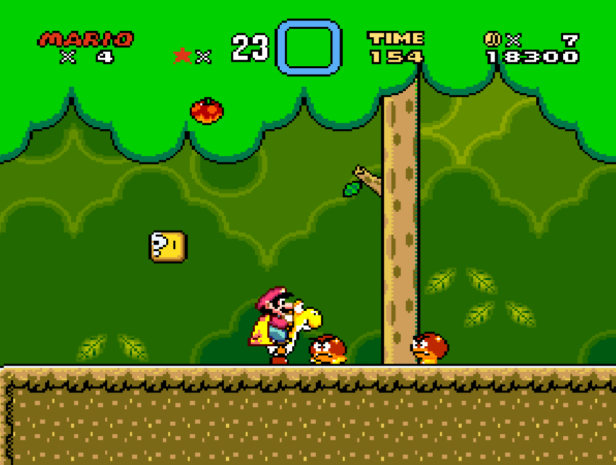 Mario starts on a flat platform with a Wiggler marching around on it. After jumping over the Wiggler, there is a pit that Mario must jump over. Mario then finds a narrow platform with a red Koopa Troopa, a Rotating Block, and a Prize Block containing a power-up. Mario then finds three narrow platforms over another bottomless pit. Mario must jump across these platforms while dodging the red Koopa Troopas on the last two platforms. Next, Mario finds a long platform with a Prize Block containing an egg. Mario must ride Yoshi and traverse across the platform while dodging a Wiggler and some Goombas, one of them being winged. At the end, there is a springboard that Mario can take. After Mario jumps across the bottomless pit, he finds another long platform containing a Wiggler, a row of Jump Blocks, a Rotating Block containing a 1-Up Mushroom, and two Empty Blocks. The next platform has three Wigglers and a row of thick trees that obscures Mario's view. On the next platform, Mario finds a Midway Gate suspended in midair.