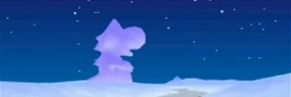 In this stage, it is snowing, and there are snowmen to serve as obstacles. It looks to be in the middle of a snowy field, since the track is placed on a very big snow terrain. There is a wide open area filled with rows of snowmen and a giant ice Mario statue. The last part of the track, racers drive trough a snow mountain, which appears to be dug out so the track may be raced on. Near the start, there is a giant Yoshi statue to the left side of the track.