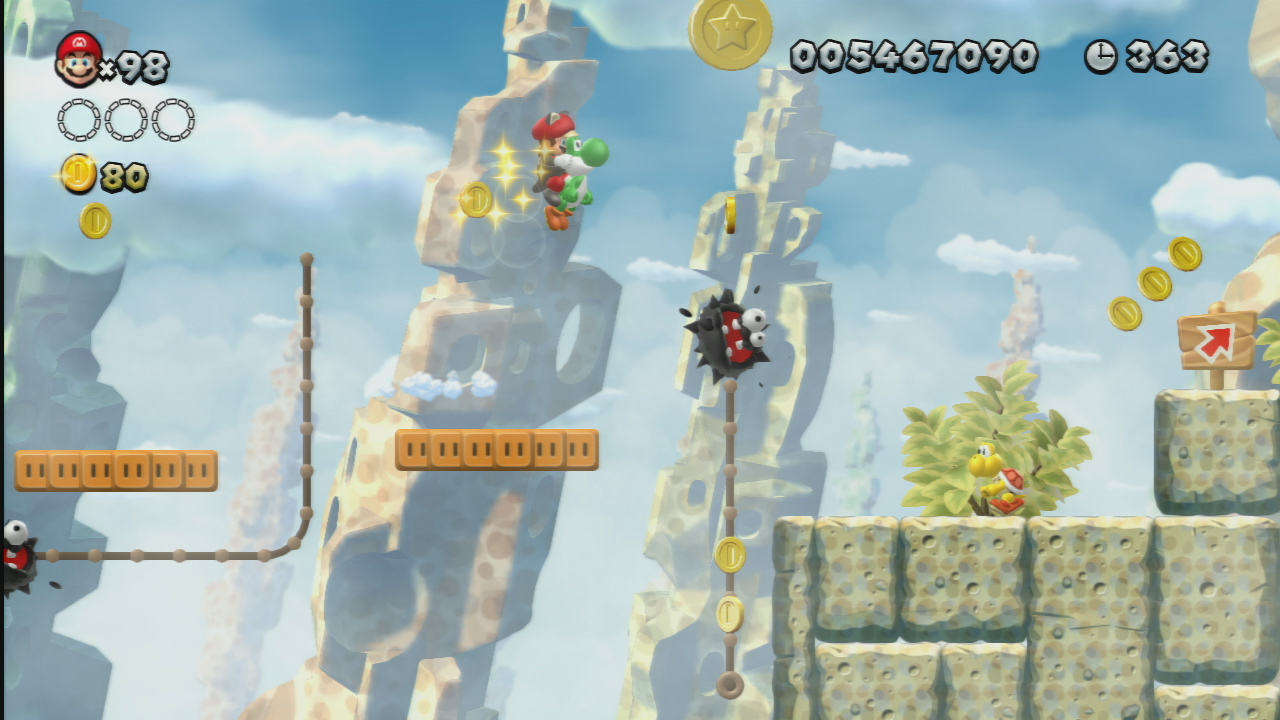 - Star Coin 2: Before the section with a spinning four-way platform is a green Warp Pipe that leads to the second Star Coin. The player needs Yoshi's Flutter Jump in order to reach the Star Coin.