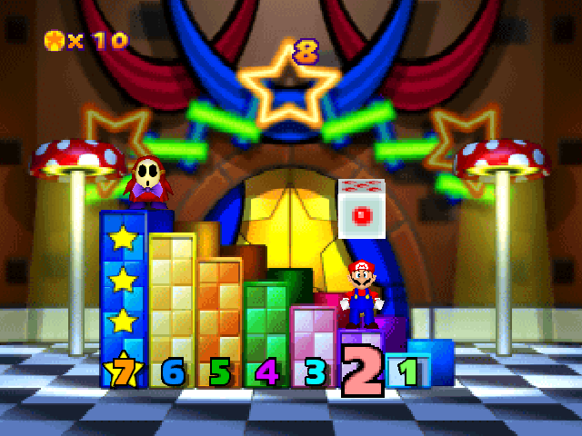 Game Guy's Lucky 7 is a special game in which the player might defeat Game Guy and win more coins. All the player has to do is to roll the Dice Block once, then Game Guy will do the same. After the first turn the player can decide if he/she wants to roll again, after this Game Guy can decide if he wants to roll again. If the player gets 2-6 and is higher or on the same step as Game Guy's, then his/her coins will be doubled. If the player is on the 7th step, then his/her coin total will be multiplied by 10 but if the player passes the 7 or if they're lower than him, then he/she will lose all of his/her coins.