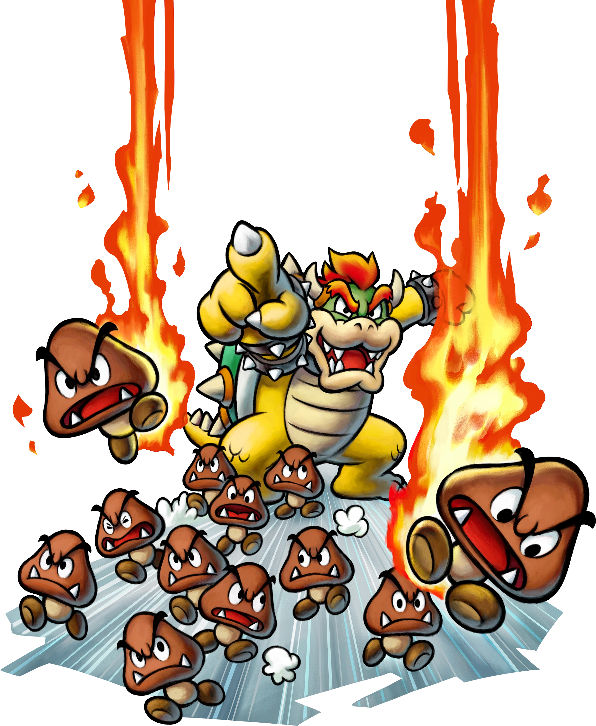 When using this, Bowser holds a spherical pile of Goombas in his hand. When the player taps the Touch Screen, the Goombas charge at the selected enemy. Bowser can launch a fireball at each Goomba for them to inflict extra damage. After the non-burning Goombas have attacked, the burning ones fall over the foe. This moves costs 6 SP to use. To get an excellent, 18 Goombas have to hit an enemy while on fire.