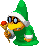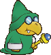 "This is a Green Magikoopa. He's one of the magicians in the Koopa clan. I have to admit, I like those green robes. Very cool! Max HP: 11, Attack Power: 3, Defense Power: 0 He can magically increase the defense power of others. He looks pretty surly."