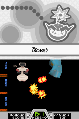 At first, the player must use their Stylus to tap a few cans so that they land in one of the platforms; from highest to lowest, they reward 300, 800, and 5,000 points respectively. While the points add to the score, this is just for style and does not affect gameplay. After this, the player has tap a barrel drum repeatedly to crunch it up and destroy it, upon which a graphic of a Nintendo item is released, either a Nintendo Entertainment System, R.O.B. (specifically the Family Computer model in all versions), a Power Pad, an NES Advantage, an NES Zapper, or a Super Scope, the only one of these items to be associated with the Super Nintendo Entertainment System and not the Family Computer or the Nintendo Entertainment System.