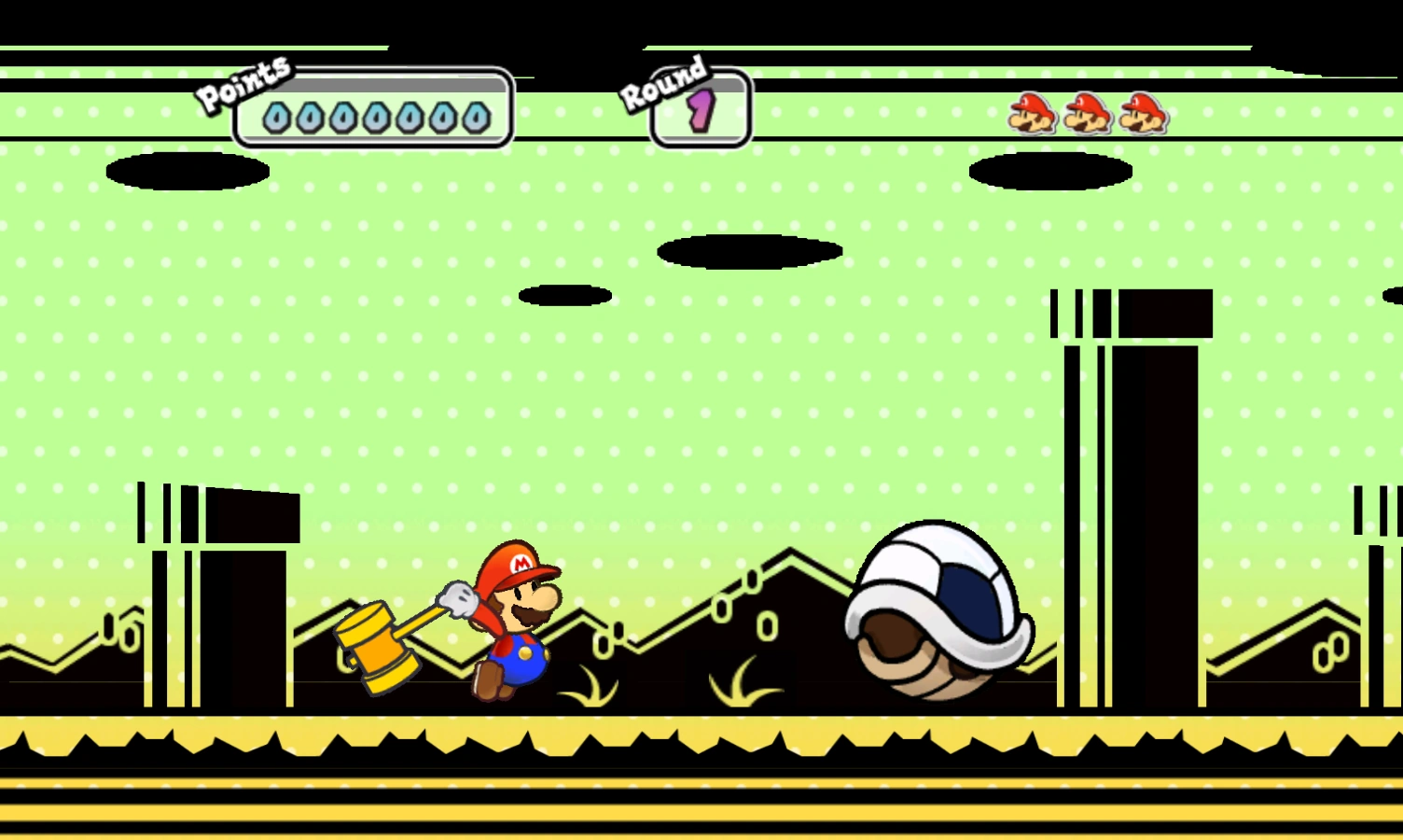 The player will have to hold the Wii Remote vertically, and the player will need swing the remote down to swing the hammer to whack the shells that are kicked by a Koopa Striker. The player needs to whack all the shells to score points. If the player gets hit, they will lose a life. If the player loses all three lives, the game is over. The player has to clear 100 Levels to win the game.