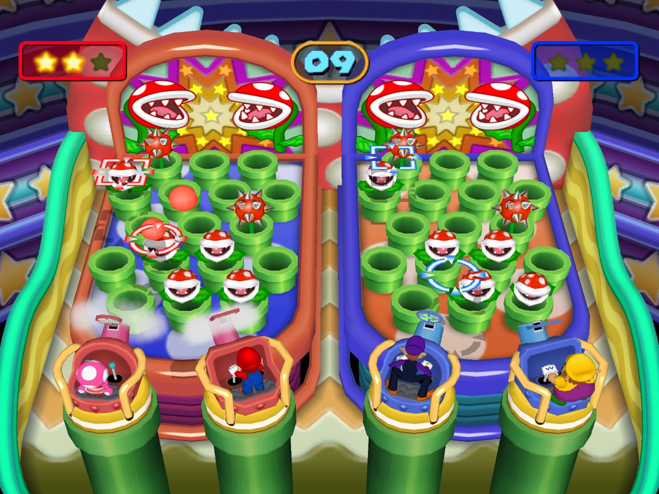 On each team, the two characters have to cooperatively shoot every Piranha Plant as they pop out of the pipes. If a bomb is hit, several more Piranha Plants appear, making it increasingly harder for the team to win. The first and second characters of a team use a round target cursor and square target cursor respectively. If the two teammates try to shoot the same target simultaneously, their projectiles will hit each other and be destroyed upon contact. When a team shoots every Piranha Plant on its side, they earns a point. The first team to earn three points wins.