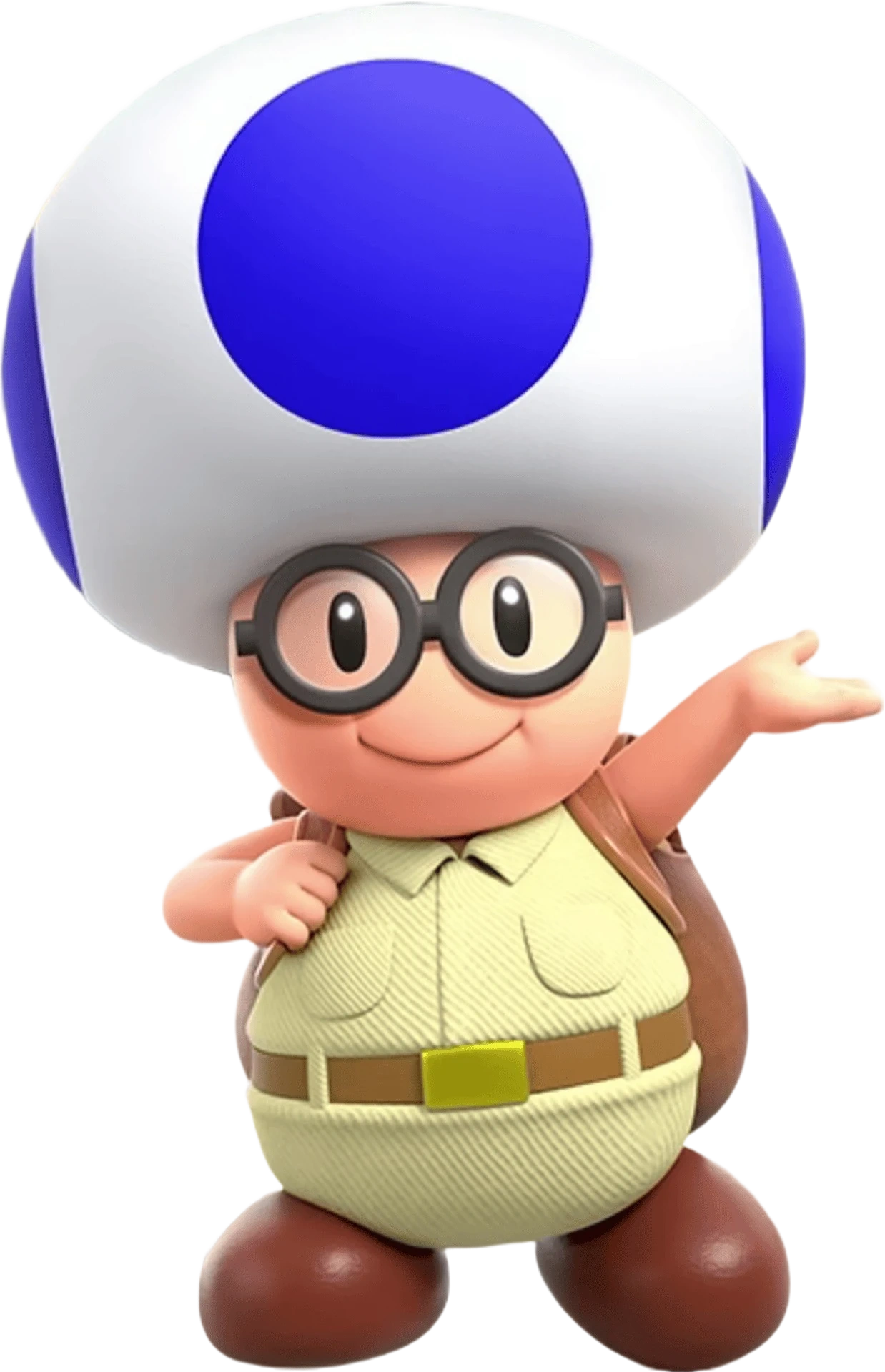 The Hint Toad (also commonly referred to as simply Brigade Blue Toad) is a Blue-colored Toad character who first appeared in Super Mario Galaxy were he is part of the Toad Brigade. Unlike his other other members, Hint Toad is the only Toad that wears goggles, which depicts him being the smartest Toad of the group.
