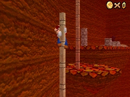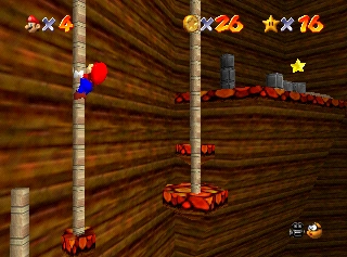 Upon entering the volcano, Mario starts on a path at the very bottom. He has to follow it to the ledges that ring around the volcano's walls. As he continues upward, Mario encounters a few different types of obstacles, including several flamethrowers, Bullies, and a hidden smasher. After this, Mario has to jump across several platforms, one of which has a Spinning Heart. After this, Mario has to climb and jump between a few poles until reaching a high ledge, where the Power Star floats above a stone structure.