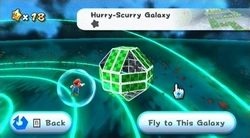 The Hurry-Scurry Galaxy is a galaxy in Super Mario Galaxy. Whenever Mario steps on a shrinking tile, it will disappear within a few seconds. There is a planetoid with the shrinking tiles and a Black Hole in the center. Therefore, Mario or Luigi cannot afford to stay in one place for too long. There are also Music Notes that Mario must collect to get a Power Star.