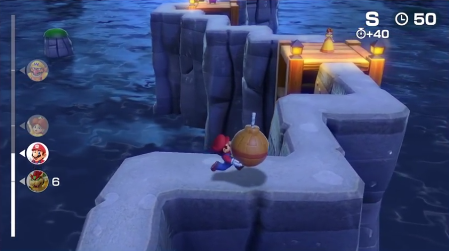 Each player is standing on the platform waiting for the player to pass the bomb until they reach the Toad. If the player falls off, the players sulk while the player that fell is placed back to the place they last fell.