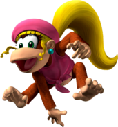 Dixie Kong is Diddy Kong's girlfriend and one of the more popular Kongs. Though she first appeared in Donkey Kong Country 2 as Diddy Kong's sidekick and later made the starring role of Donkey Kong Country 3. While she didn't return in Donkey Kong 64, her sister, Tiny Kong, served as her replacement. Her next time featured as a playable character was in the GBA remake of Donkey Kong Country 2. She appeared once again in the Japan-only Donkey Konga 3. She is also a playable character in Diddy Kong Racing DS and Mario Super Sluggers for Wii. Dixie is remembered by her ability to twirl her hair to float downwards. Dixie Kong has secured her place as one of the main Donkey Kong characters and appears 3rd only to Donkey and Diddy.