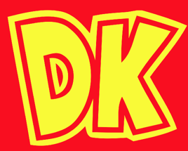 The emblem is the initials D and K red embroidered with yellow. The emblem is visible on Donkey Kong's tie and several other objects, including barrels, coins, pennants, portals, dirt piles, stars, flags, and switches.