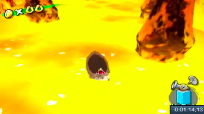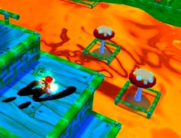In Super Mario Sunshine lava is seen in Corona Mountain as the primary obstacle to avoid. One touch of the lava will instantly kill Mario forcing him to restart the area from the beginning. Mario has to make use of F.L.U.D.D and the boat to avoid stumbling into the lava, more often than not, there will also be Blue Coins dangling over the lava forcing Mario to work out a strategy to obtain them. A type of Pollution similar to lava called Fiery Goop is found in Pianta Village which takes one health point off Mario upon contact thus burning him. It can be dozed away with either F.L.U.D.D or accurate splashes from the lake water.