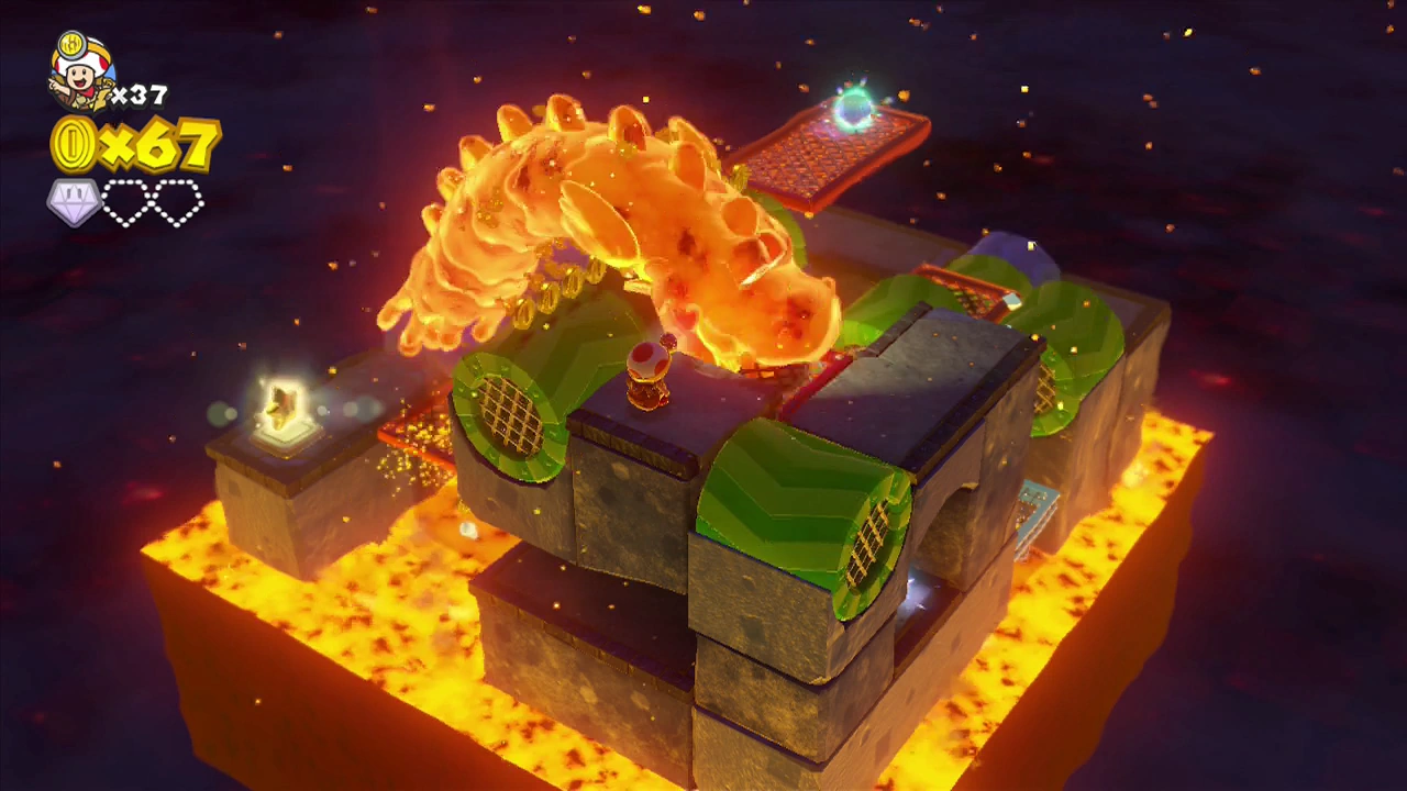 Lava is seen again in various levels of Captain Toad: Treasure Tracker. In this game, lava can be seen around various levels (typically the latter ones) and Captain Toad and Toadette must use their maneuvers to avoid falling in the lava. If the Toads are to fall into the lava, they will be instantly killed. Some platforms sink and rise out of the lava in a tidal manner, additionally, Charvaarghs are also seen leaping out of the lava pools as a very dangerous hazard for Captain Toad and Toadette to avoid. Additionally, the bosses Draggadon and Gold Draggadon also reside in lava and attack the Toads from the fiery substance. Lava is seen in levels such as Rolling Inferno and Seesaw Sizzle.