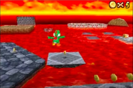 In the first Paper Mario game, lava appears in Mt. Lavalava and Bowser's Castle. Falling into the lava makes Mario lose one hit point, Mario must use the platforms to hop across the lava, in cases where there are no platforms and just a large lava lake, he must have Parakarry or Lakilester to carry him over lava.