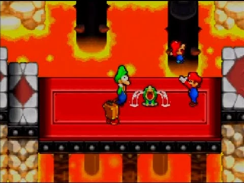 In Mario & Luigi: Superstar Saga, lava is seen around Bowser's Castle but cannot be fallen in in the main level. There is a side-scrolling section involving the use of Mini-Mario where he must make it across a section (based on one of the Castles from Super Mario Bros.) and avoid falling into the lava. Podoboos are also seen hopping out of the lava, if Mario falls in the lava or touches either a Podoboo or a Roto-disc, he is sent all the way back to the beginning. At the end of the area, Mario pulls an Axe sending a cardboard cutout of a Fake Bowser plummeting into the lava below.
