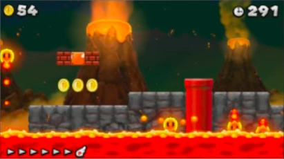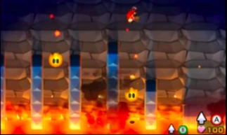 Podoboos hopping out of the lava in New Super Mario Bros. 2.
