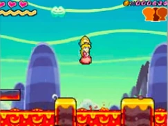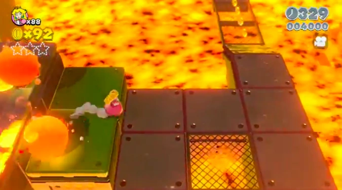 Peach making her way across the predictable moving rising/lowering platforms while outrunning the Splorches and avoiding the lava.