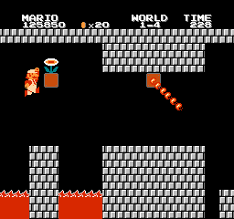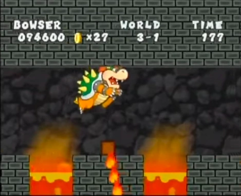 Lava appears as a hazard in Super Mario Bros., Lava mainly appears in Castle levels where if Mario falls into it, he instantly dies. In Super Mario Bros, this is a classic way of finishing off Bowser at the end of levels. Podoboos also tend to jump out of the lava serving as an obstacle to avoid when crossing the lava.