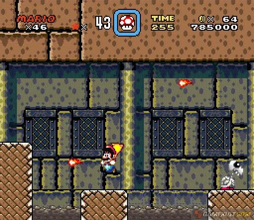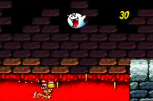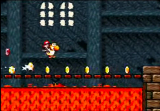 Lava appears on many levels in this game where it's purpose is the same as in the Super Mario Bros. games. Lava is commonly found in Castles and Fortress however for the first time, it is also found in caverns that go very deep underground. Some levels in Choco Island also have brown lava which has the same effect as regular lava. The first castle in this game is known for using lava to defeat Iggy Koopa. If Mario lands in lava, even if he has a Cape, he instantly dies. In addition to Podoboos, enemies known as Blarggs tend to lurk around in the lava. Larry Koopa's boss fight also has lava, in which Larry Koopa needs to be thrown into for Mario to defeat him. If Yoshi is to fall in lava, he will slowly sink rather than instantly dying. If Mario falls in the lava while on Yoshi, both will instantly die.