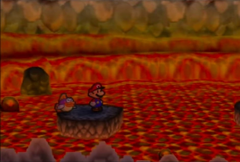 In Paper Mario: The Thousand-Year Door, lava is not seen anywhere in the main game, instead, it is found only during the two Bowser events, the first around Bowser's Castle, and the second in Stage 3-1 reminiscent of Super Mario Bros., if Bowser falls in the lava, he has to restart the area, the larger Bowser gets, the less chance he has of falling in.